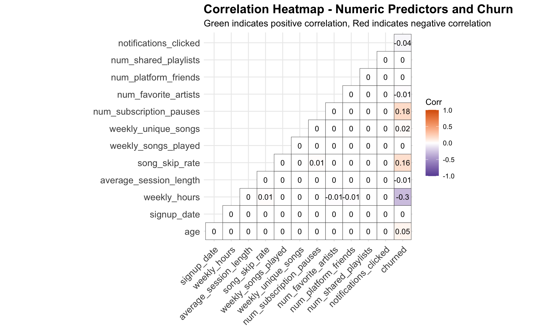 The correlation analysis shows which customer behaviors move together with churn. Most variables have weak correlations, meaning no single metric alone explains why customers leave. However, higher skip-rates (+0.16) and frequent subscription pauses (+0.18) are modestly linked to churn, while higher weekly hours (-0.3) appear linked to retention. These signals suggest that disengagement patterns, rather than demographics or platform activity counts, are stronger early signs for churns.
