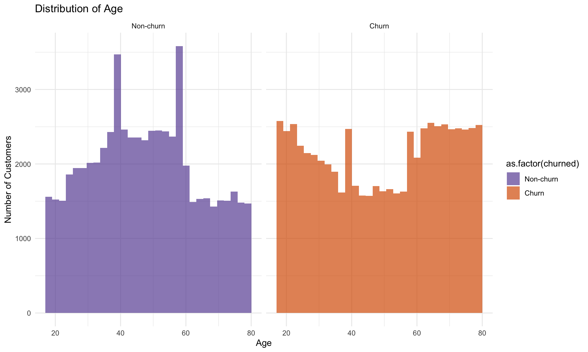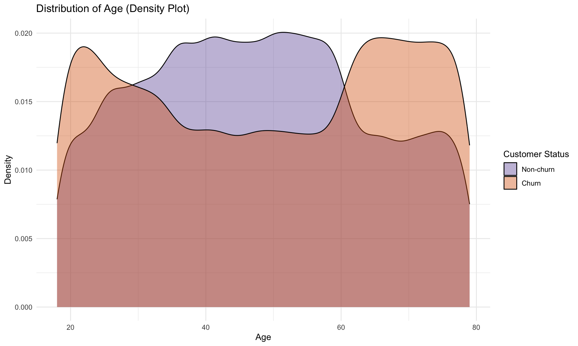 Observing the histogram, churn and non-churn customers flatten across ages 25-60, showing no standout demographic in the middle ranges. The density plot, however, highlights that churn spikes at the edge with both younger (<25) and older (>60 ) groups are more prone to leave.