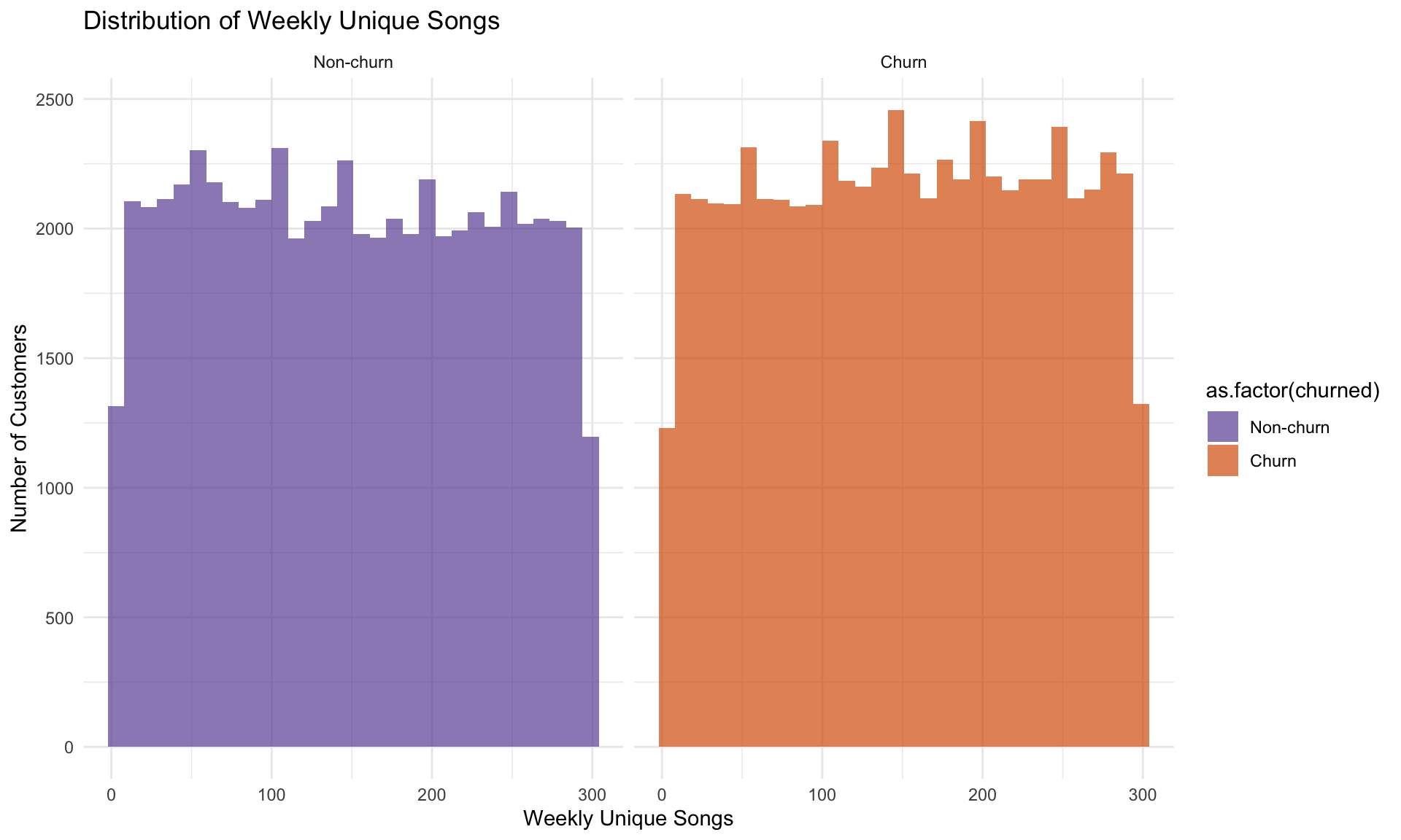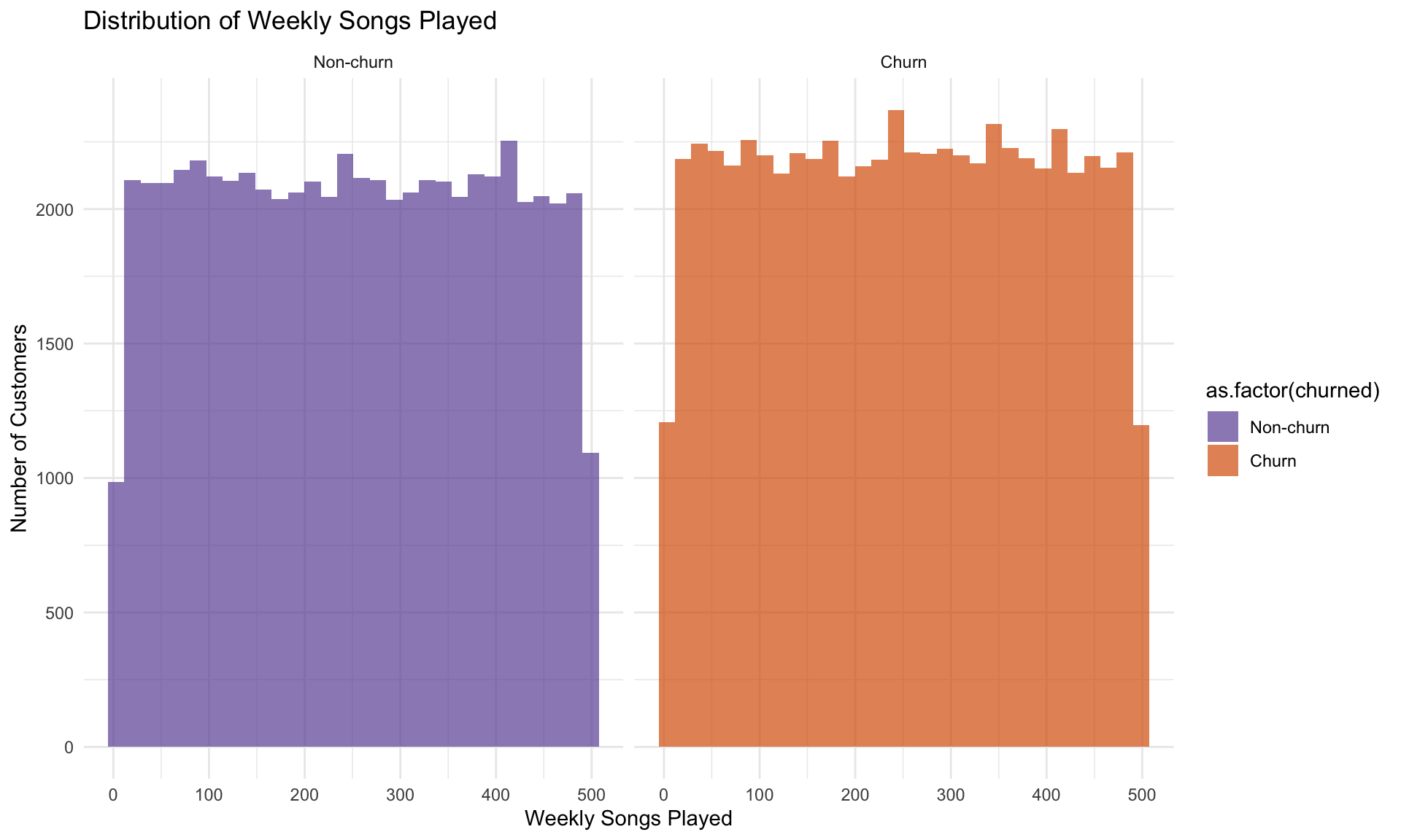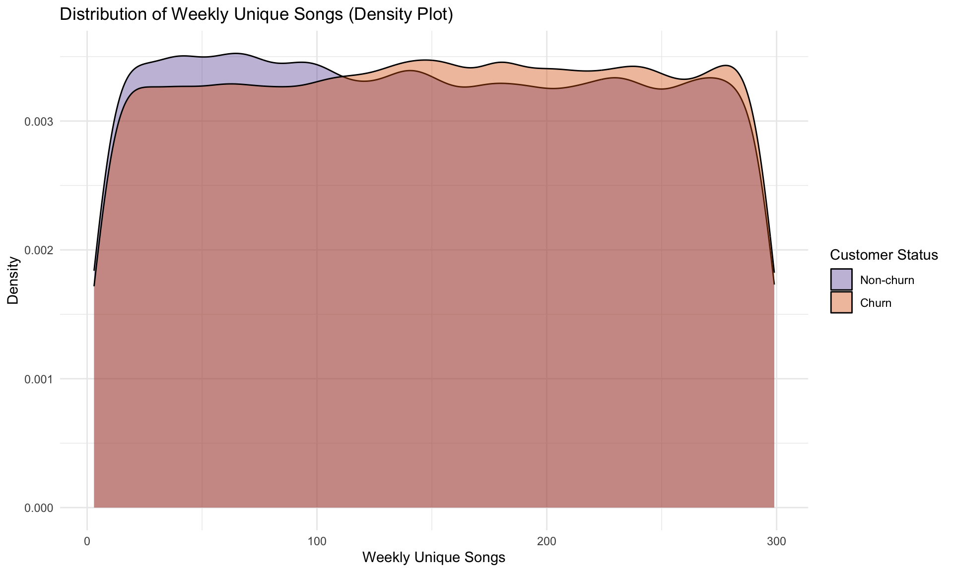 Histogram shows even, flat patterns for both churned and non-churned customers. The density plot confirms little separation, meaning the total number of songs played weekly has limited impact on churn behavior.