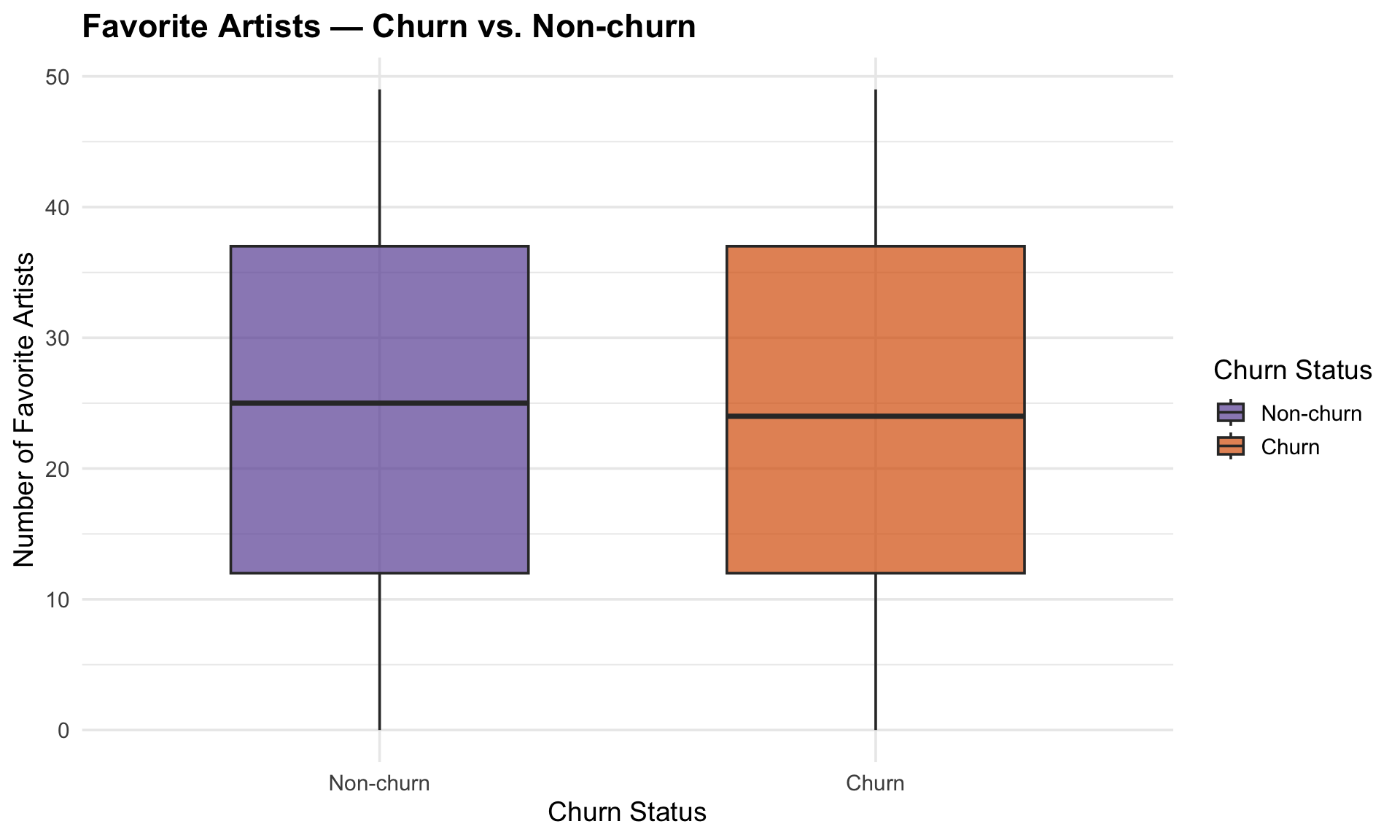 The number of favorite artists is balanced across churned and non-churned groups, indicating this factor does not strongly influence churn.