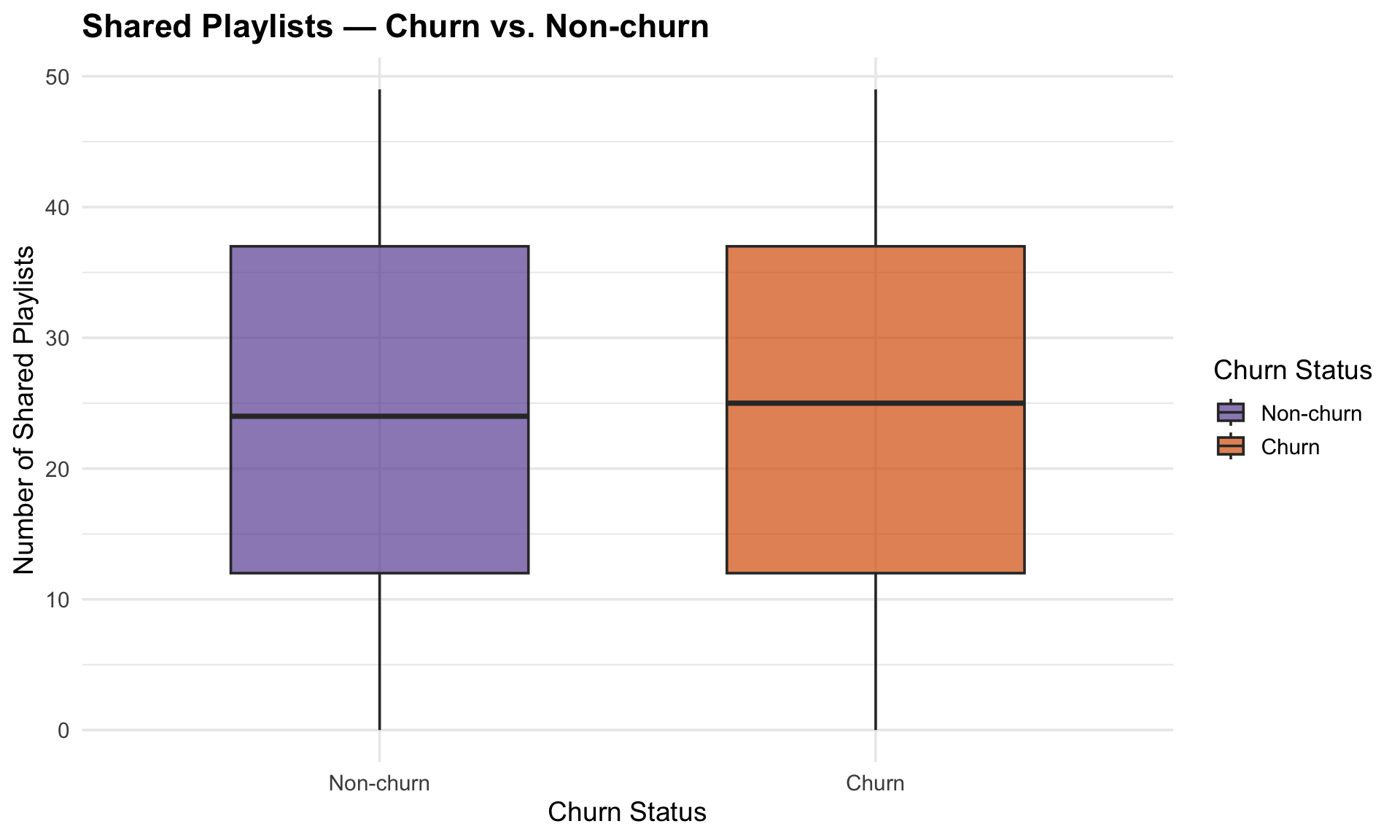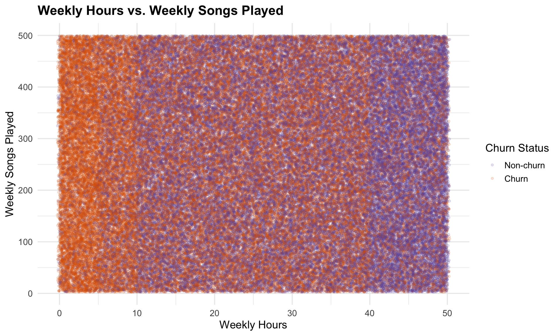 When we look at the scatter above, churned customers cluster more in the lower-left corner with fewer weekly hours and fewer songs played. This highlights that customers with minimal engagement are at higher risk of leaving, while heavier users (higher weekly hours and song counts) are more likely to remain loyal.