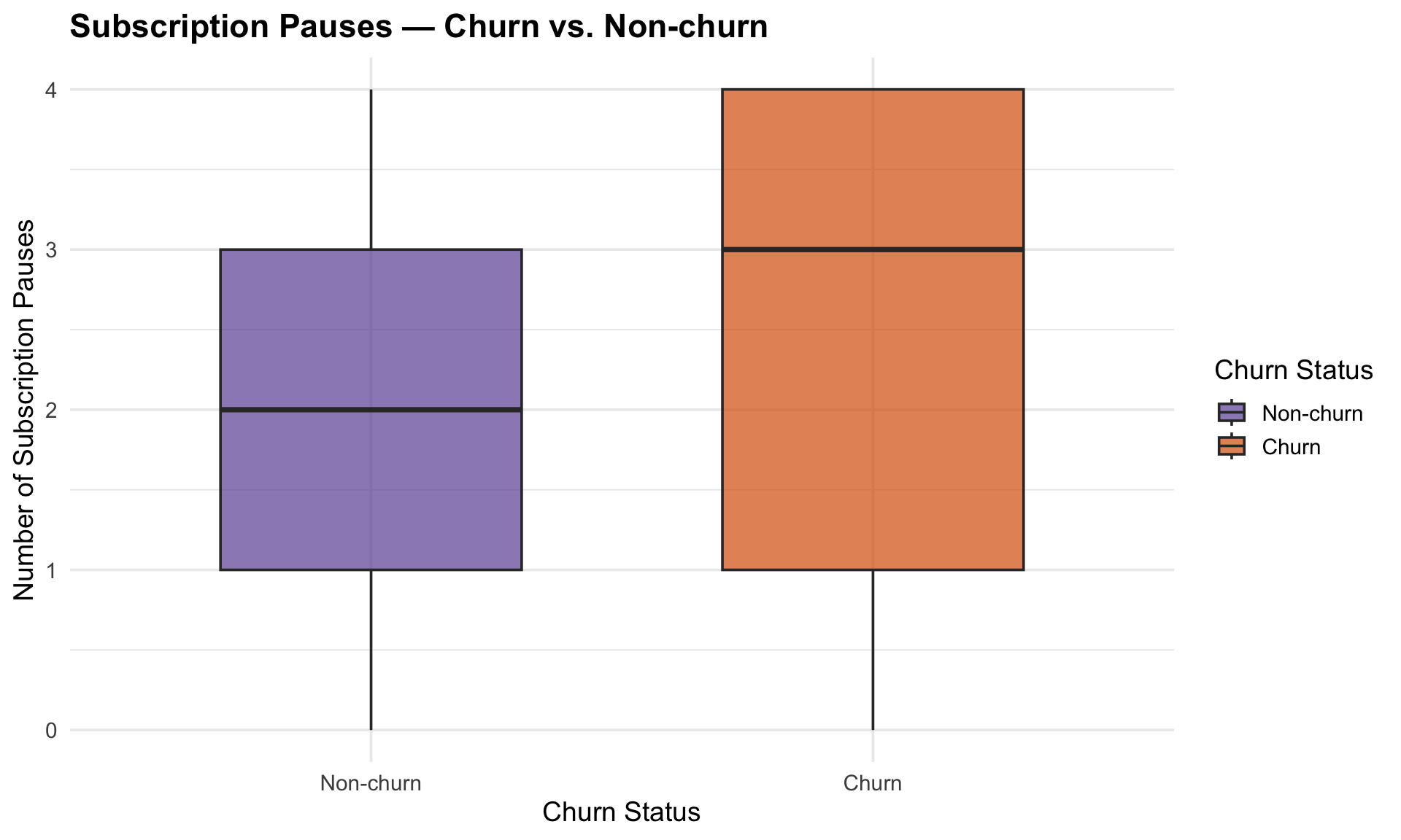 A clear difference emerges here as churned customers average three subscription pauses versus two for non-curned, signaling that repeated interruptions are an important churn marker.