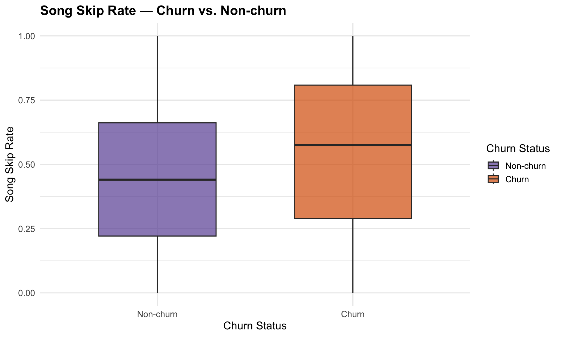Churned customers display a higher skip rate, pointing to dissatisfcation with music recommendations and potential misalignment with user preferences.
