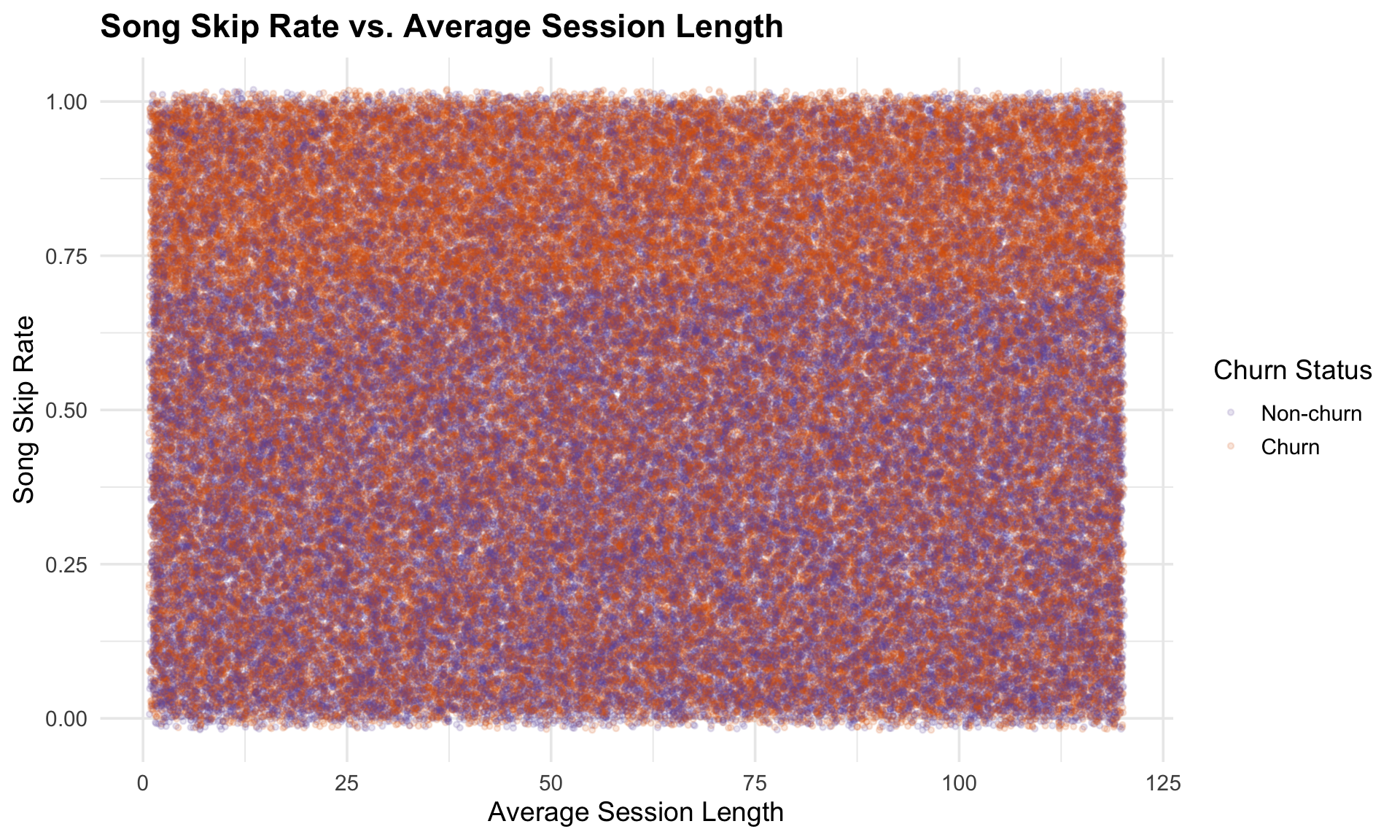 Here, we observe churned customers concentrated at higher skip rates across all session lengths. This suggests that dissatisfaction with music recommendations is a churn driver, regardless of how long customers spend per session. Non-churned users maintain lower skip rates, indicating better alignment between their expectations and platform experience.