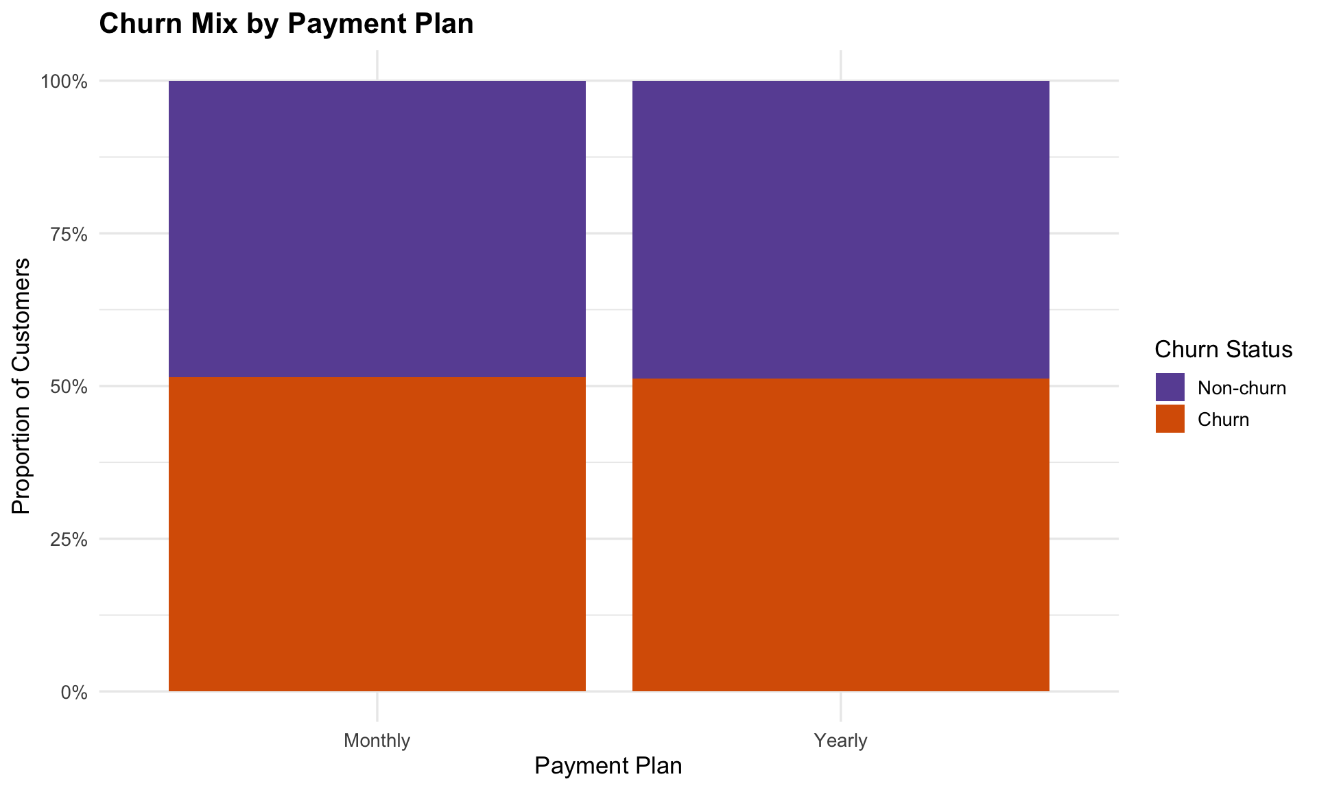 The alluvial plot was created to examine how payment plans and payment methods flow into churn outcomes. It helps us see if billing preferences are linked to retention risk. The flows show that churn is evenly distributed across both monthly and yearly plans, as well as across all payment methods (credit card, debit card, Apple Pay, PayPal). In other words, how customers pay does not significantly influence whether they stay or leave.
