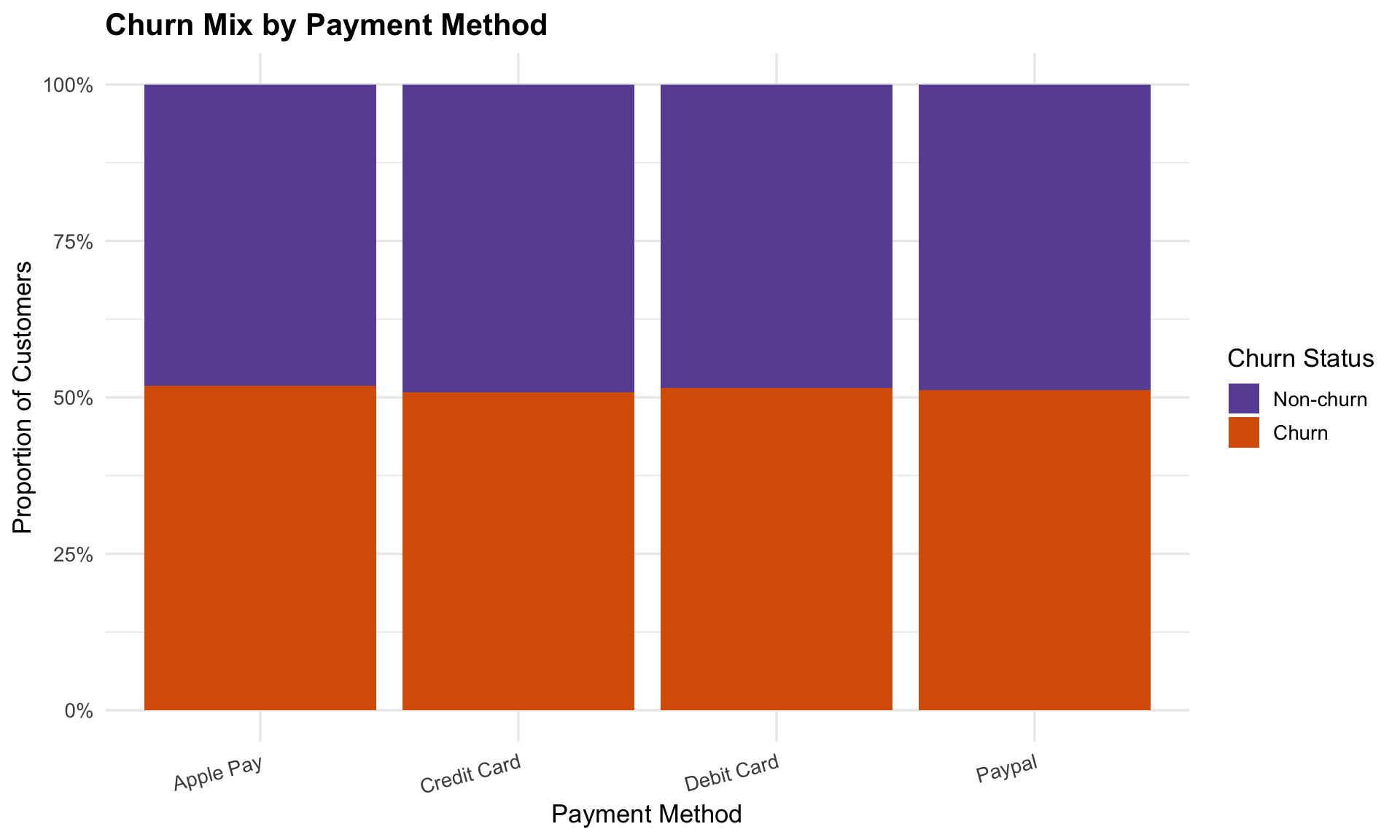 Churn distribution remains balanced across debit card, credit card, Apple Pay, and PayPal users, meaning payment choice is not a driver for churn.