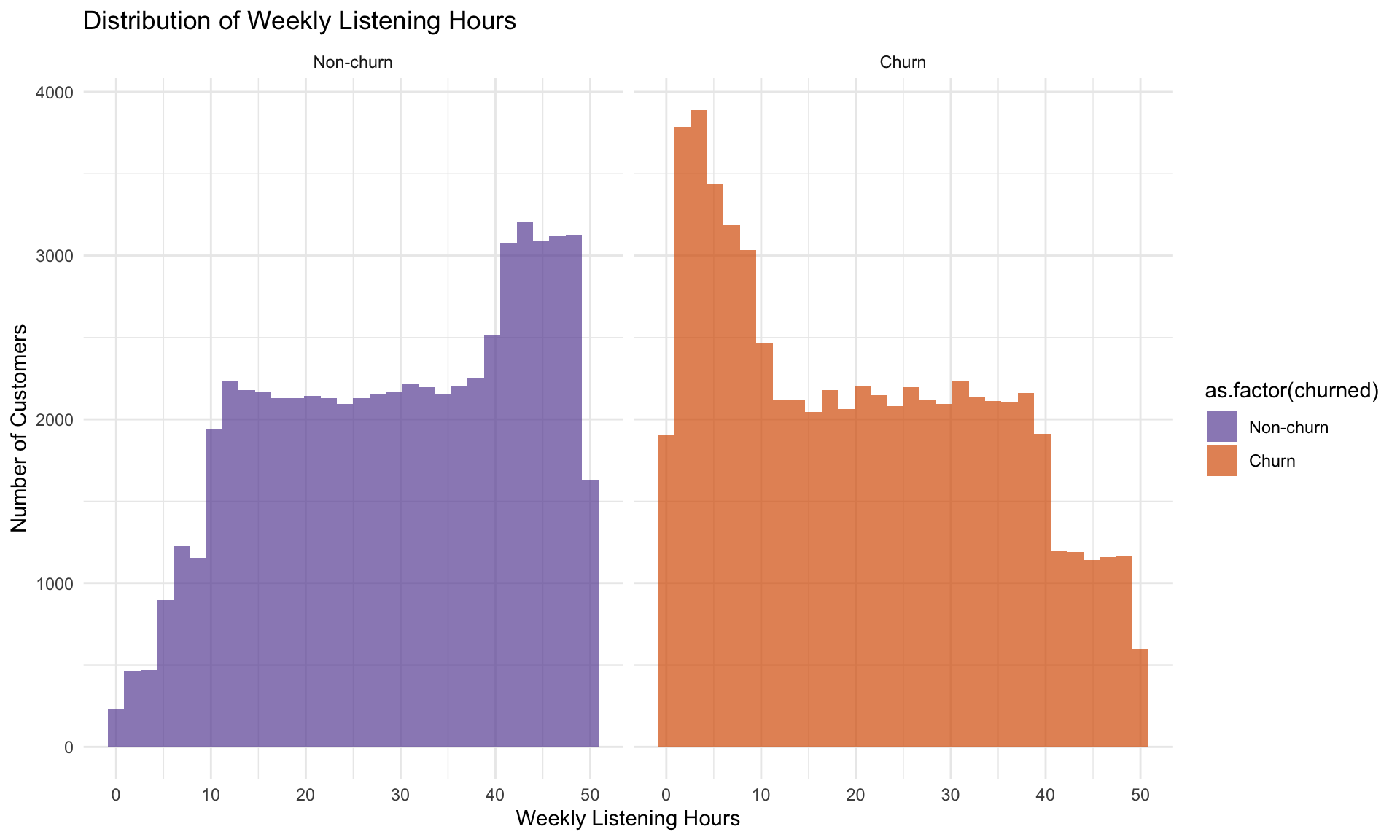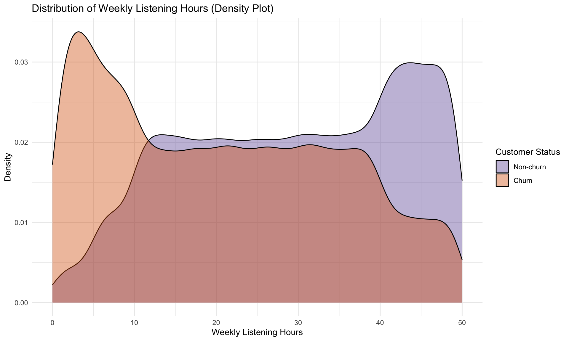 From the histogram, churned customers are clustered at the lower end (0-10 hours), while non-churns extend into higher listening ranges. The density plot reinforces this by showing churn density peaking in low engagment bands, while non-churns dominate the 30-50 hour range.